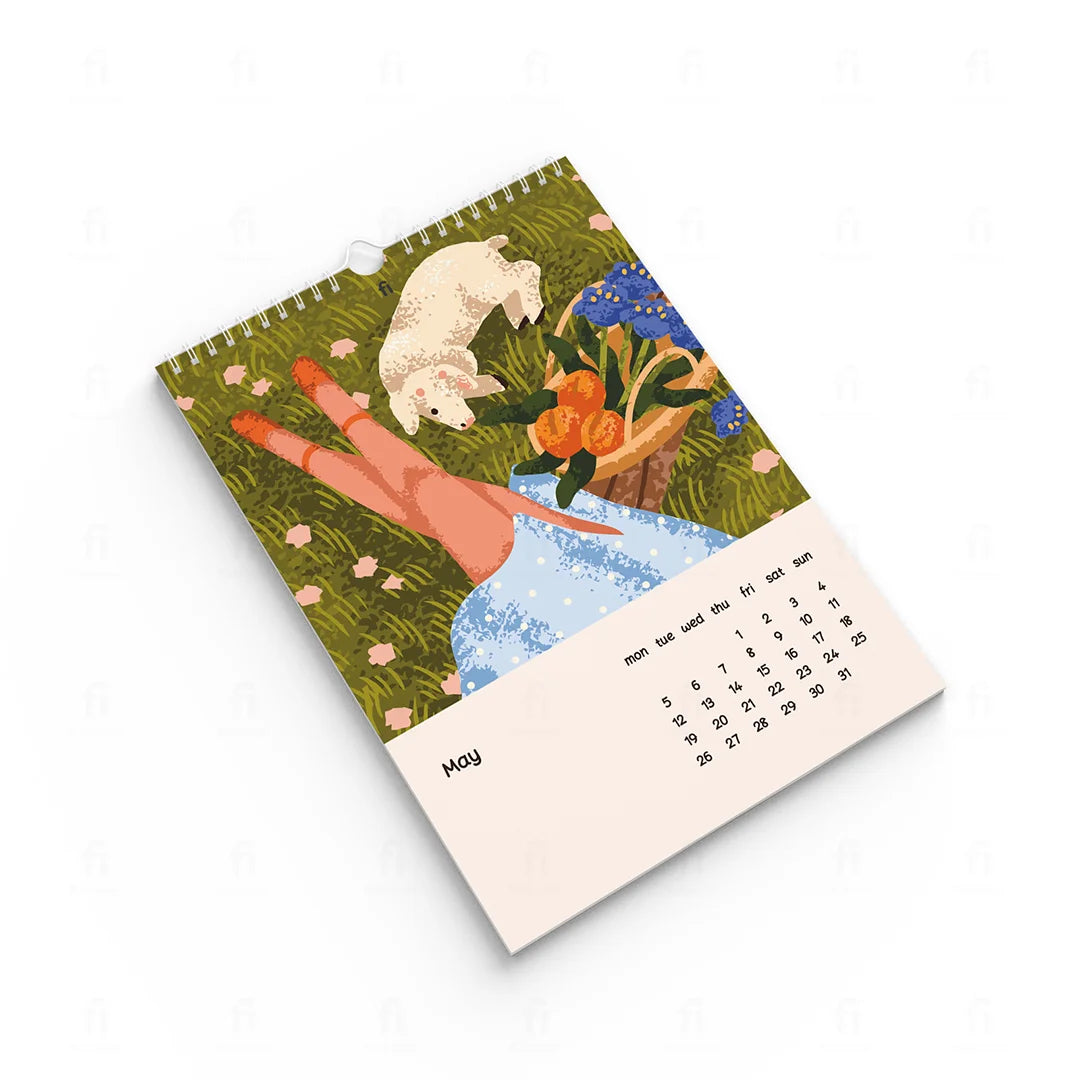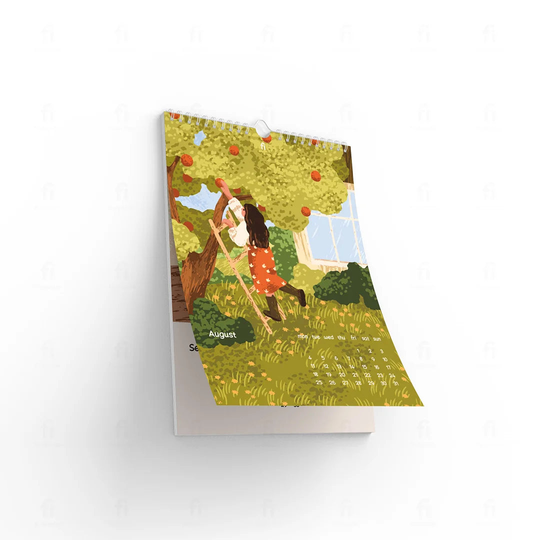 Każdy miesiąc ozdobiony jest autorską ilustracją w swobodnym, uroczym stylu, inspirowanym codziennymi chwilami pełnymi ciepła i spokoju. Kolorowe, ręcznie tworzone grafiki wnoszą do wnętrza harmonię i wyjątkowy klimat.