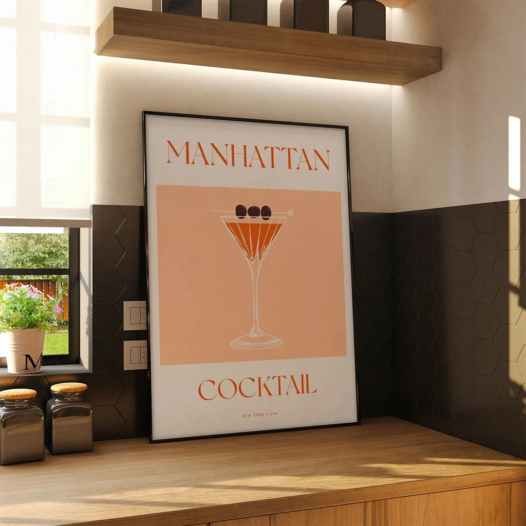 Poczuj klimat nowojorskiego baru! Ten plakat z klasycznym koktajlem Manhattan to idealny wybór do kuchni, salonu lub baru domowego, gdzie może inspirować do przygotowywania tego pysznego napoju. Elegancki design i ciepłe barwy dodadzą wnętrzu wyrafinowanego charakteru.