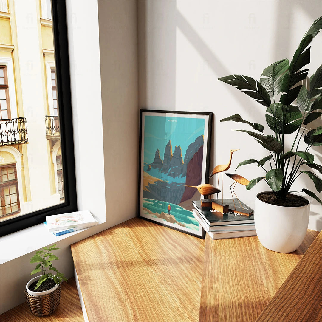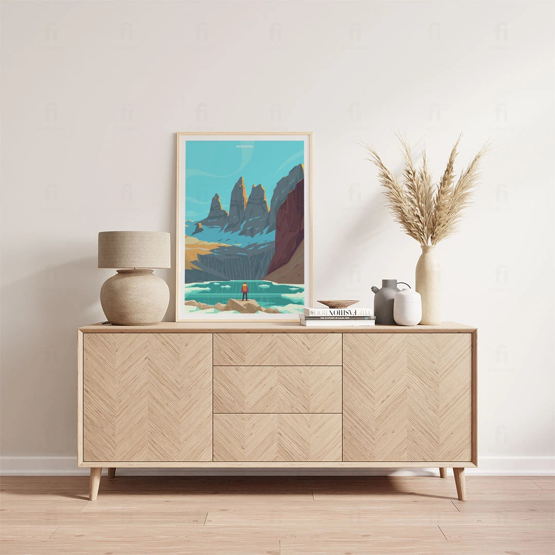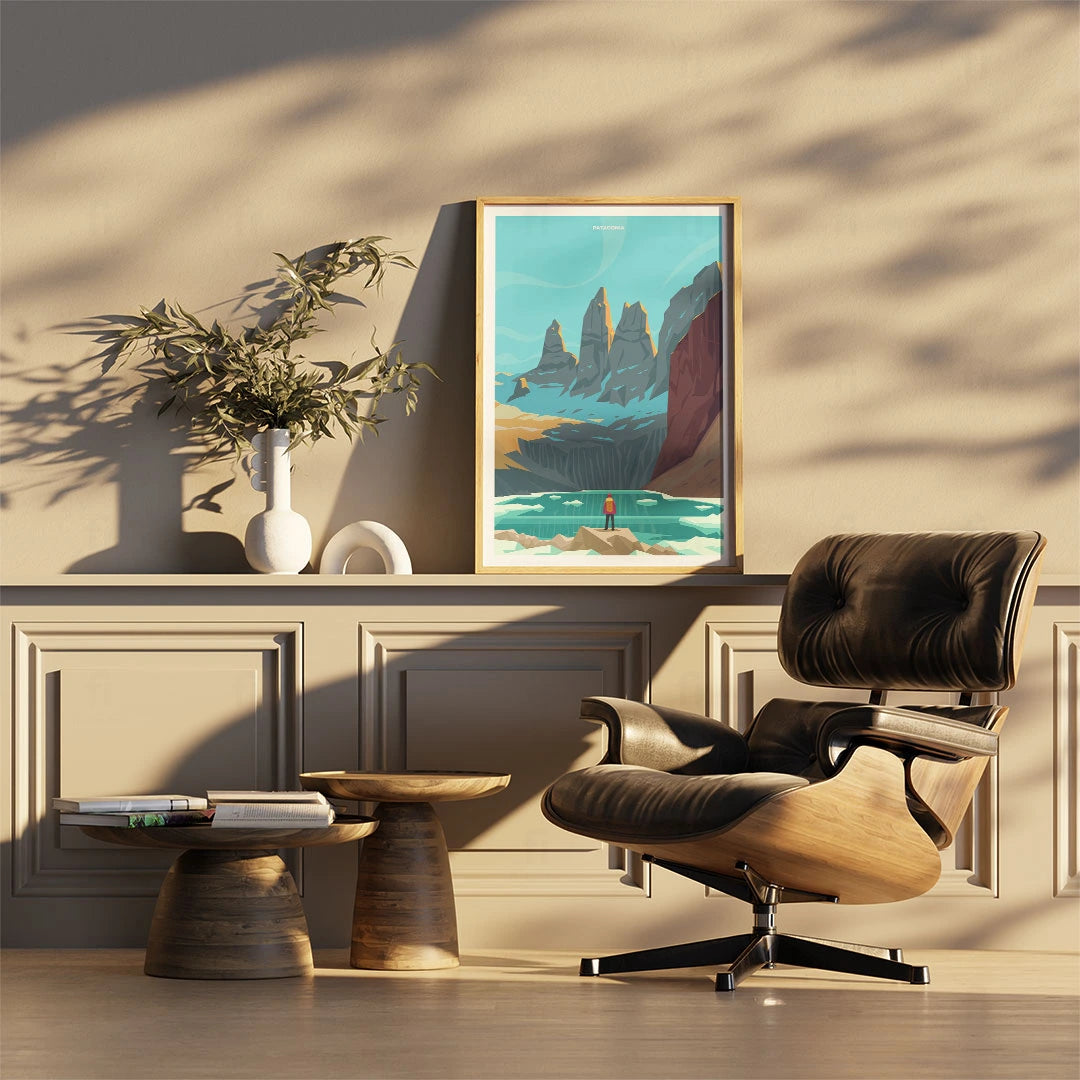Plakat "Patagonia" Odkryj dziką i surową piękność Patagonii z imponującymi szczytami Torres del Paine i wnieś do domu klimat wielkiej wyprawy.