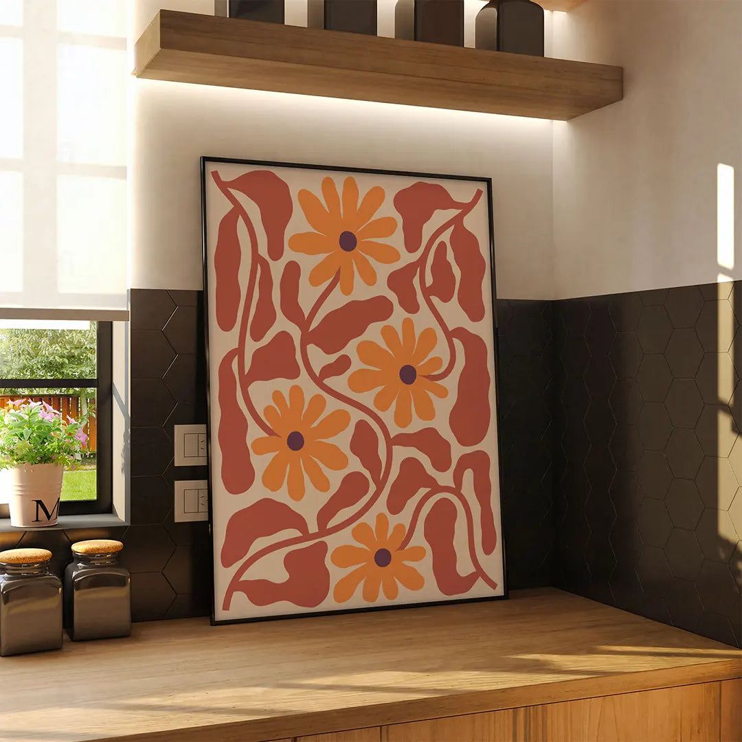 Zatrać się w gąszczu dzikich, jesiennych kwiatów. Ta energetyczna grafika, pełna splątanych łodyg i pomarańczowych astrów, przywodzi na myśl spacer po ukwieconej łące w ciepłym, popołudniowym słońcu. Paleta barw w odcieniach pomarańczu i rdzy nadaje kompozycji nostalgicznego charakteru w stylu vintage.