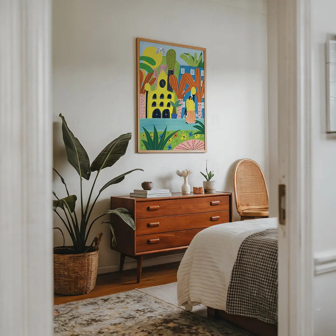 Tętniące życiem, ale pełne uroku – takie jest miasto na tym plakacie. Ilustracja w stylu "sztuki naiwnej" zachwyca feerią barw: od słonecznej żółci architektury po błękit nieba i zieleń miejskich ogrodów.