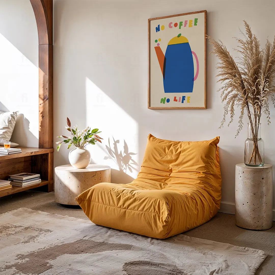 Prosta prawda życiowa dla każdego kawosza: bez kawy nie ma życia! Ten energetyczny plakat z niebieskim dzbankiem w stylu retro i kolorową, wycinankową typografią to idealny sposób na ożywienie kuchni. Grafika jest radosna, bezpretensjonalna i codziennie rano przypomina, co jest najważniejszym punktem programu.