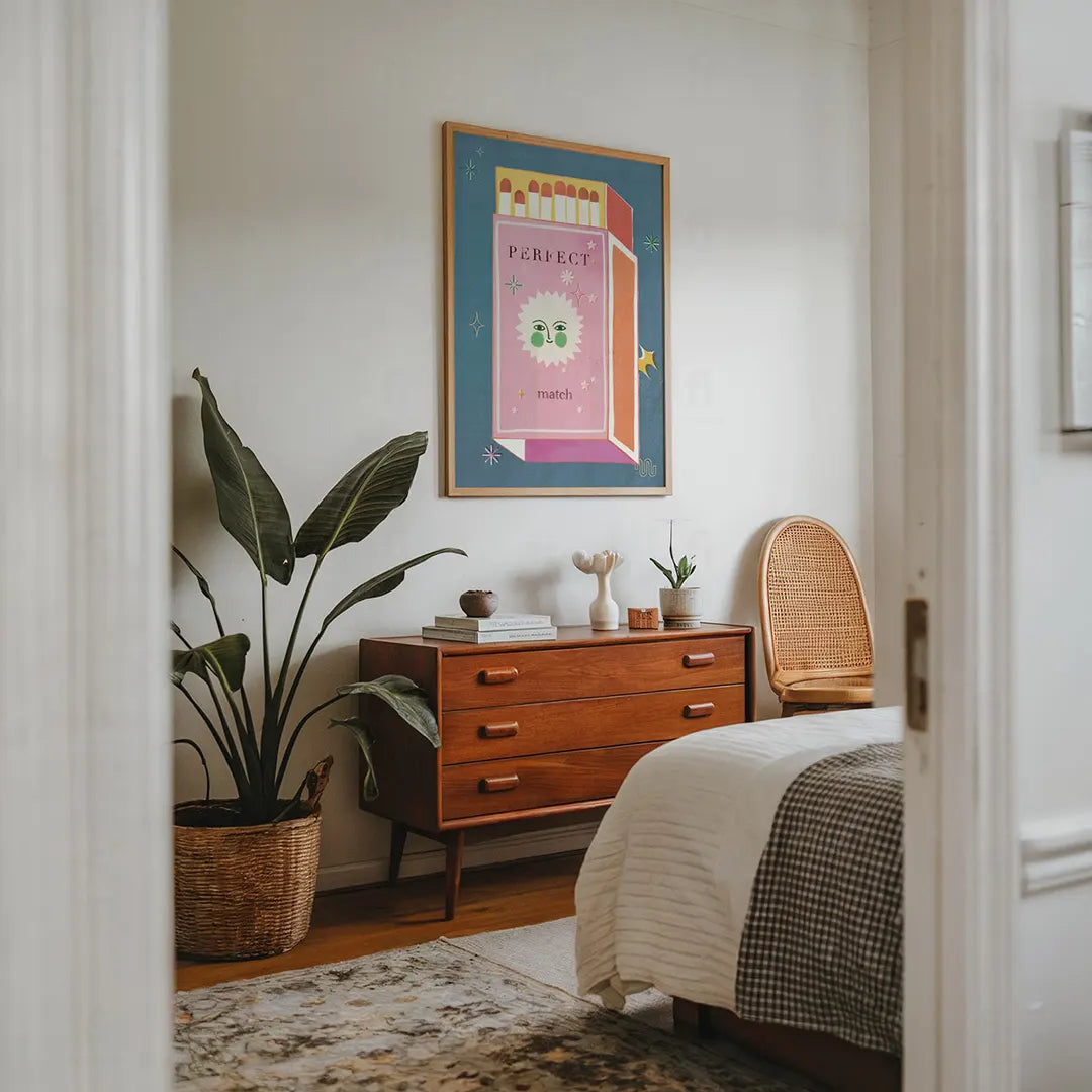 Ten uroczy plakat z pudełkiem zapałek to słowna i wizualna gra ("match" to po angielsku zarówno zapałka, jak i dopasowanie). Różowa kolorystyka, retro typografia i uśmiechnięte słoneczko tworzą ciepłą, romantyczną atmosferę bez cienia kiczu. To miłość w stylu vintage.
