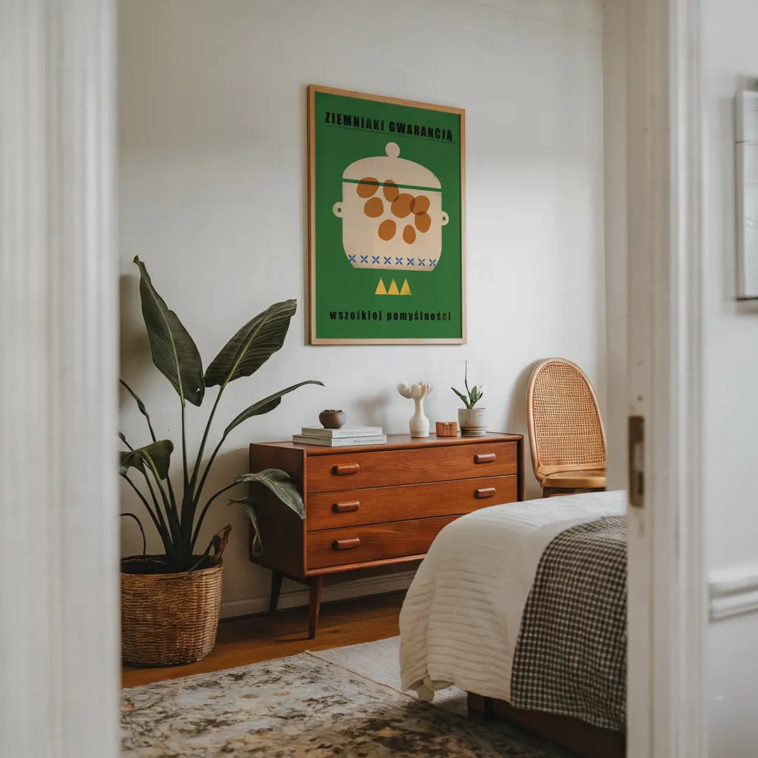Niech żyje król polskiego stołu! Ten plakat z hasłem „Ziemniaki gwarancją wszelkiej pomyślności” to humorystyczny hołd dla warzywa, bez którego trudno wyobrazić sobie obiad. Ilustracja wielkiego garnka na zielonym tle w stylistyce PRL-owskiego designu to idealny sposób na wprowadzenie do kuchni luzu, koloru i odrobiny nostalgii.