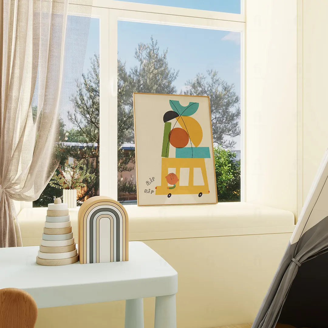 „Bip, bip!” – czas na małą wielką podróż! Ten plakat z żółtym autobusem to spełnienie marzeń każdego małego fana motoryzacji. Ilustracja w stylu retro jest łagodna, ciepła i pełna uroku, w przeciwieństwie do krzykliwych bajkowych plakatów. Autko wiozące geometryczne skarby pobudza wyobraźnię i zachęca do snucia opowieści o dalekich wyprawach przed snem.